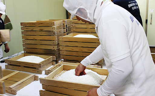 米こうじは酒蔵で日夜お酒を造っている蔵人達が、あまさけに相応しい米こうじを全量手作業で造っております。