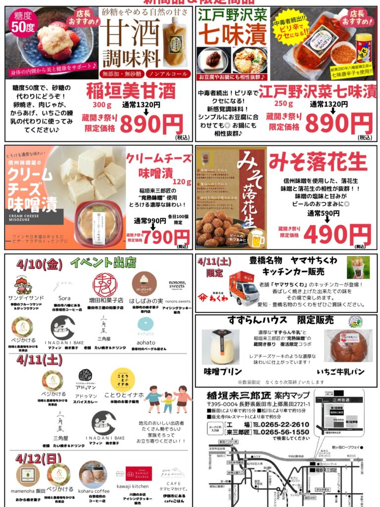長野県飯田市に蔵を構える味噌・漬物蔵元 株式会社稲垣来三郎匠は4月10日から12日の3日間、「春の味噌蔵開き祭り」を開催致します。